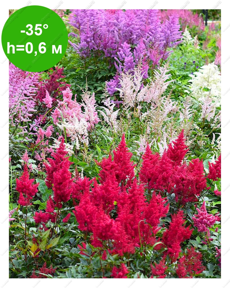 Микс сортов, в который входят лучшие неприхотливые и морозостойкие сорта астильбы: Этна, Юник Руби Ред, Америка, Делфт Лейс, Спотлайт, Мэгги Дэйли, Гранат, Пумила. Оригинальное декоративное растение Астильба очень популярно у ландшафтных дизайнеров, флористов, профессиональных цветоводов и у садоводов-любителей.