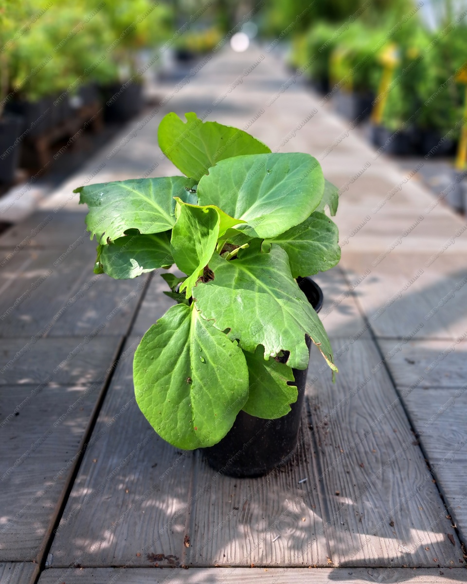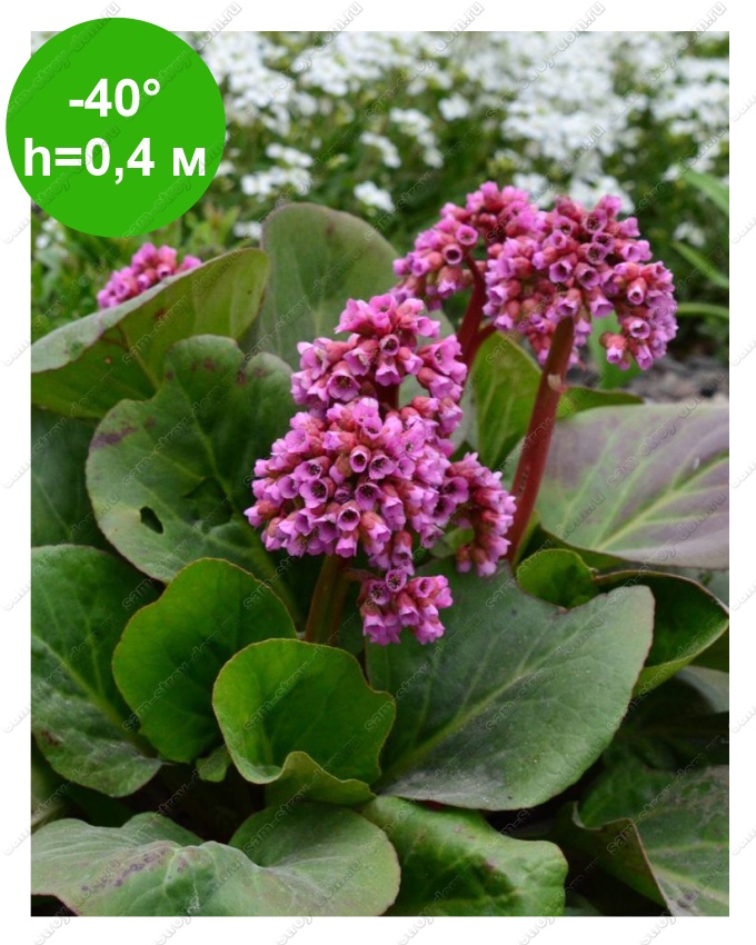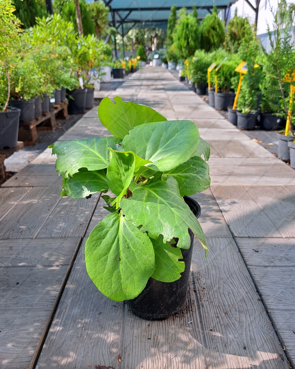 Растение, давно полюбившееся многим садоводам.Листья крупные, округлые, плотные, кожистые, зеленые, осенью приобретают пурпурный оттенок, зимуют под снегом, сохраняя декоративность.