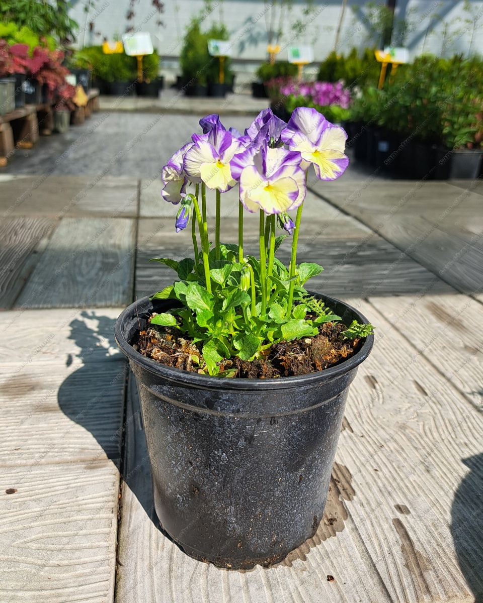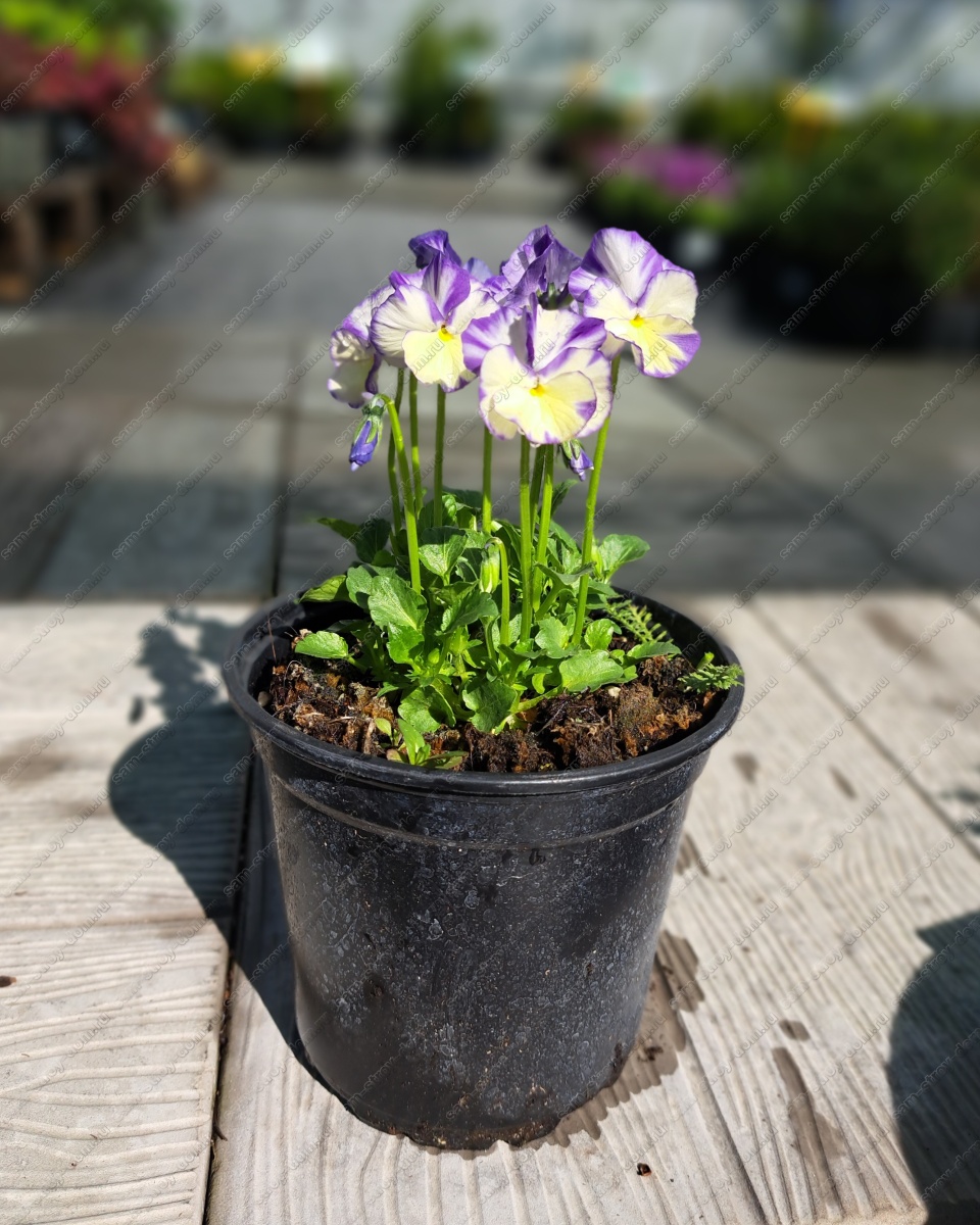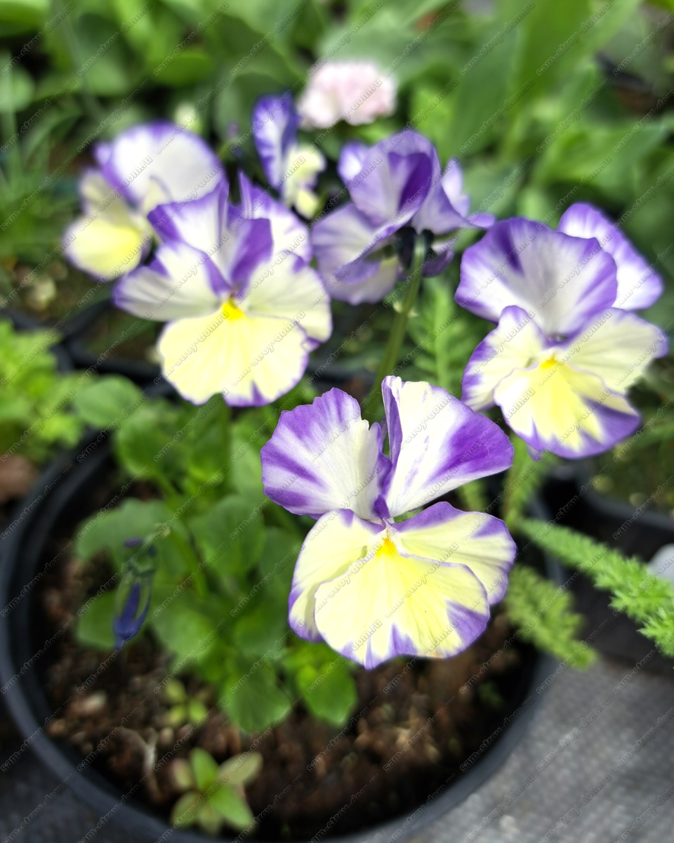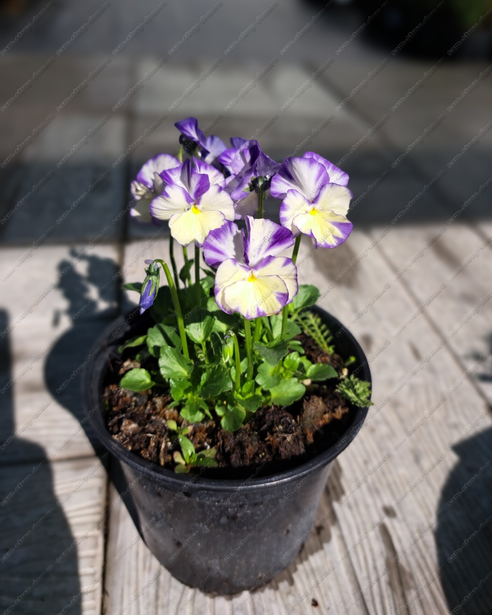 Фиалка или виола рогатая (Viola cornuta) «Ребекка» — многолетнее корневищное, травянистое растение, высотой до 10-15 см. Цветки белые с фиолетовым, резным кантом, крупные, диаметром до 4-5 см., с характерным рогообразным шпорцем. Расположены одиночно на концах безлистных побегов. Соцветия с гофрированными лепестками и желтой серединкой. Листья зеленые, сердцевидные с фестончиками по краю, собраны в прикорневую розетку. Образует пышные куртинки диаметром до 15-20 см.