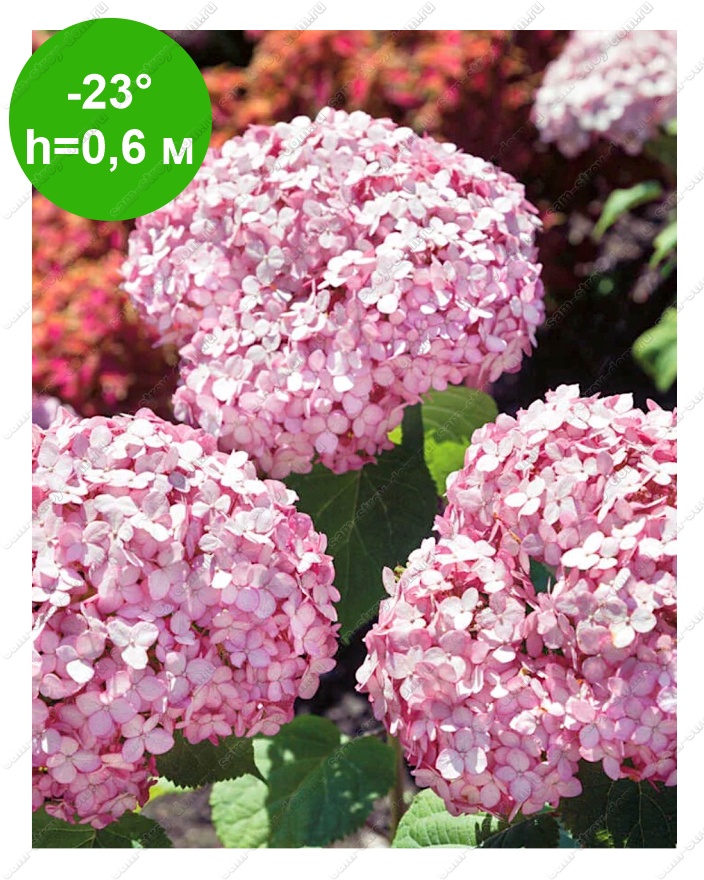 Карликовый сорт. Компактный кустарник с обилием нежных соцветий. Декоративно выглядит даже без цветения, благодаря глянцевой листве насыщенно-зеленого цвета. Соцветия многочисленные, полусферические, плотные, сначала светло-зеленоватые, потом белые, затем начинают розоветь, становятся нежно-розовыми.