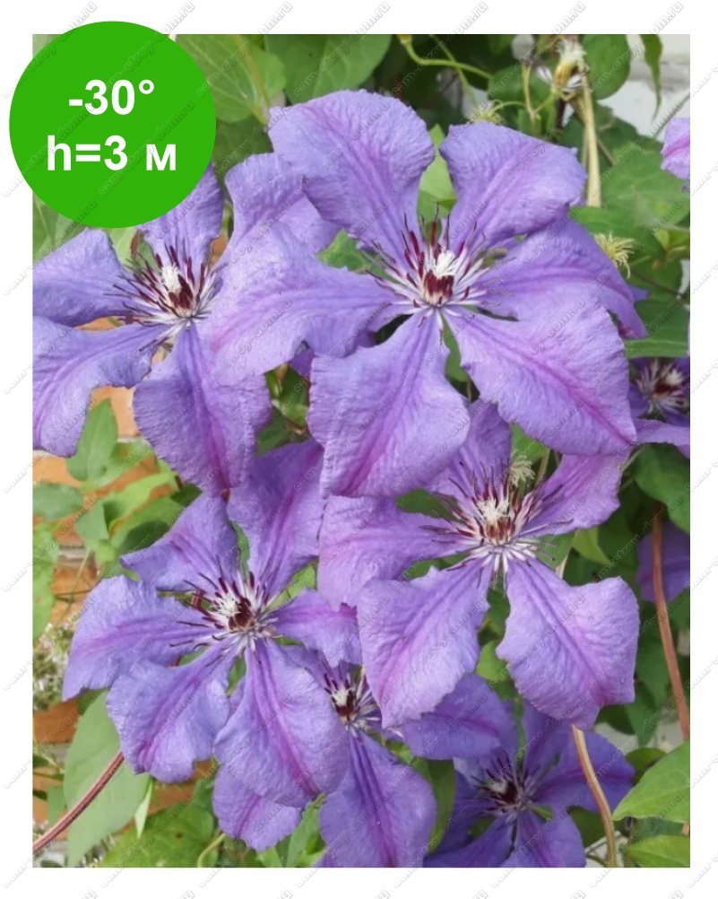 Рослая кустарниковая лиана длиной до 3 м. Листья сложные из 3(5) листочков, кожистые, зеленые. Цветки раскрытые, 12-14 см в диаметре. Чашелистиков 4-6, они ромбовидные, широкие, с волнистыми краями, фиолетово-синие, бархатистые, средняя полоса пурпурно-фиолетовая, пыльники пурпурные.