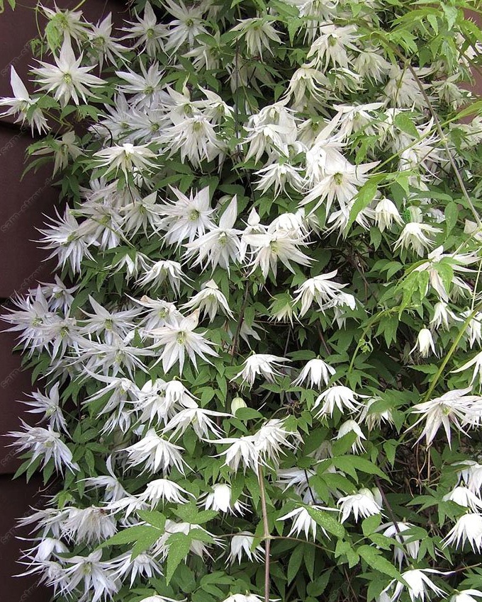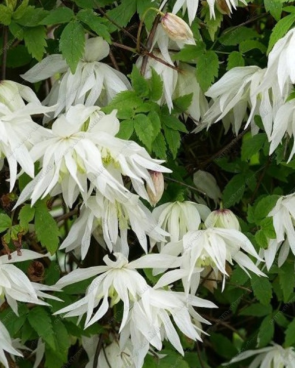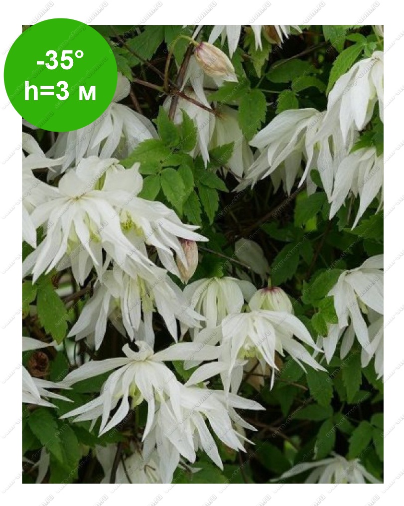 Очень востребованный старый шведский сорт. Цветы: раскрытые колокольца диам. 6-8 см. махровые, вначале бежевые, затем становятся чисто белыми. Светло-жёлтые тычины. Обильно цветёт апрель-май, на прошлогодних побегах,а после, отдельными цветами до осени. Растёт на средних, хорошо дренированных почвах. Сорт здоровый и нетребовательный. Любит хорошо освещенные места, но не сухие. Хорошо переносит полутень. Морозостойкость высокая (зона 4˗9). Сорт в обрезке не нуждается. Если нужна обрезка санитарная, то делаем ее сразу после отцветания. Совершенно неприхотлив, устойчив ко всем болезням клематисов. Очень активно цепляющаяся за все культура, дает возможность в широком использовании княжиков на приусадебном участке. Как и все клематисы очень любит мульчирование: сосновая или лиственная кора, хвойный опад, щепа и тд. Рекомендуется делать приствольный круг бордюрной лентой для задержания влаги и мульчирующего материала. На зиму желательна окучка.