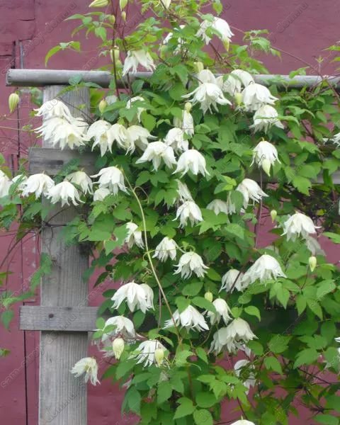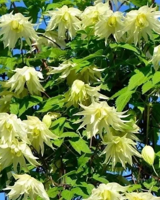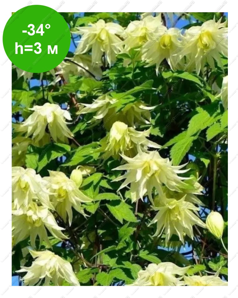 Польский сорт в продаже с лета 2012 г. Цветки всегда махровые, очень крупные для группы Атрагене (диаметром 10-12 см), светло-лимонного цвета, во время распускания бутонов – зеленоватые, а когда полностью распустятся белеют, колокольчикообразные, свешивающиеся, приятно пахнущие грейпфрутом, сидящие на пурпурных цветоножках. Тычинки с желтыми пыльниками на зеленовато-лимонных нитях и светло-желтыми пестиками. Цветет в мае и повторяет цветение, но уже менее обильно –летом. Достигает высоты 2 – 3 м. За опоры цепляется листовыми черешками.