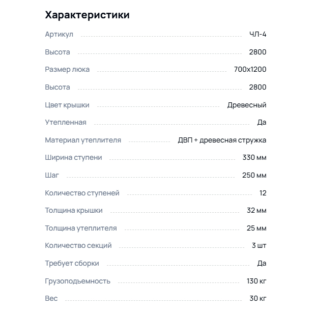 Применяется в условиях ограниченного пространства и невозможности поставить стационарную лестничную конструкцию. Изготовление деревянных элементов производится из сосны. В сложенном виде позволяет экономить пространство. Лестница состоит из трех секций, легко убирается в потолок. Крышка люка с утеплителем, что исключает проникновение холода в дом. Проста в установке.