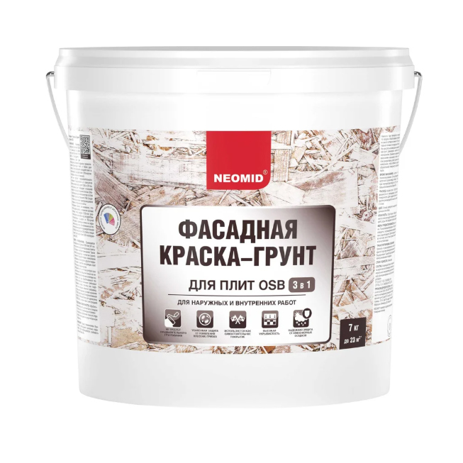 Фасадная краска-грунт для плит OSB NEOMID Proff 3в1, 7 кг Н-ГрунтКраскаOSB-7 предназначена для финишного декоративного окрашивания пенополистирольных и OSB-плит, ДСП, SIP-панелей снаружи помещения.