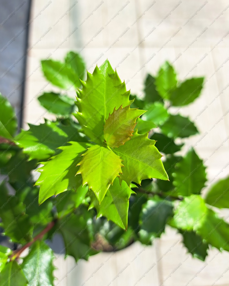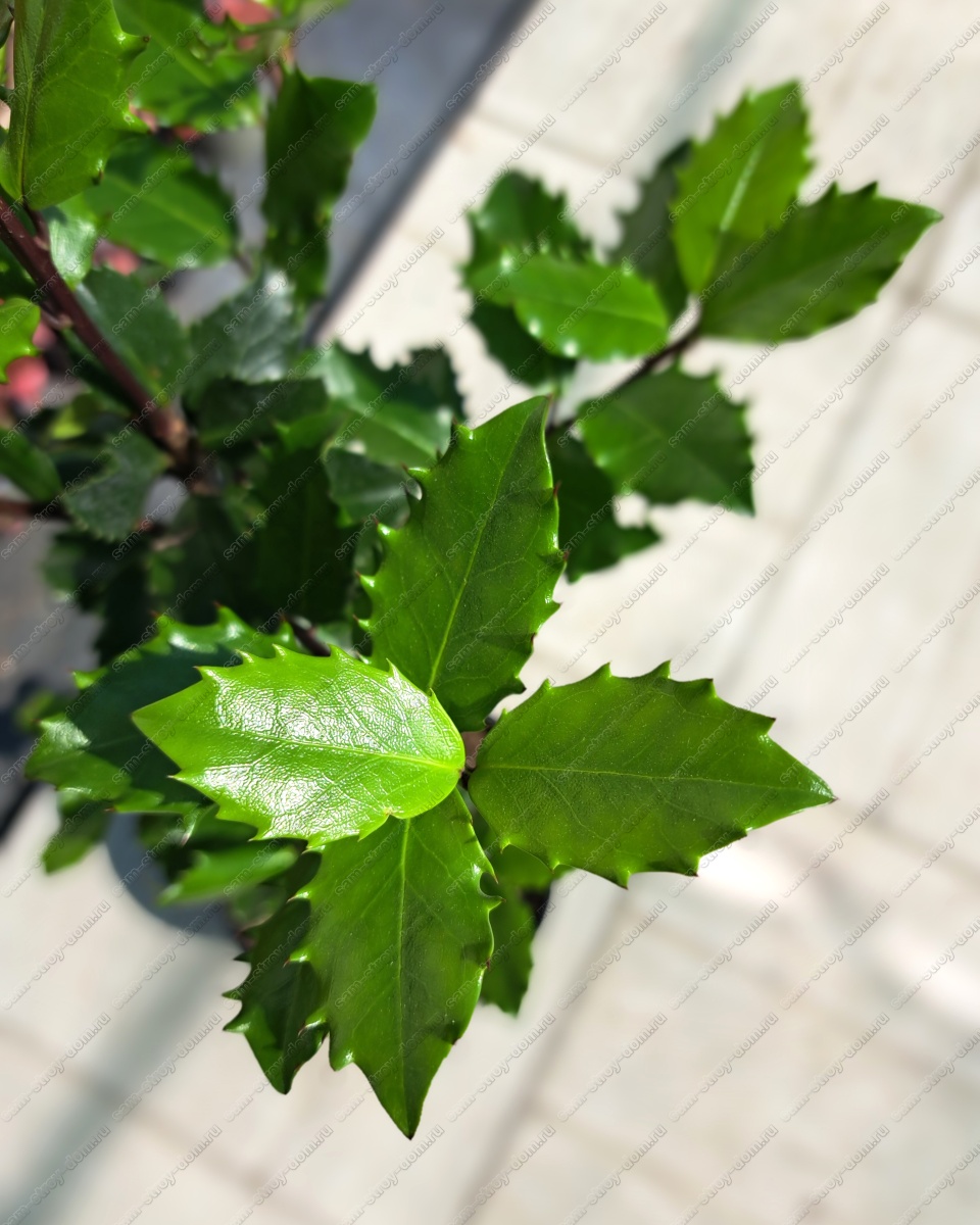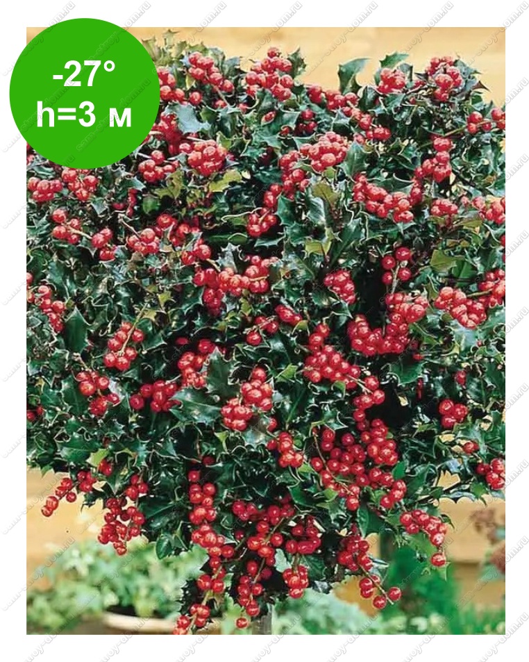 Листья плотные, тёмно-зелёные, блестящие, колючими зубцами по краям. Мужское растение - ценный опылитель для других подвидов. Плоды светло-красные, многочисленные, ядовиты.