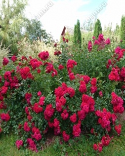 • Цветки: пурпурно-красные, махровые (110–120 лепестков). Собраны в соцветия по 5–10 штук.
