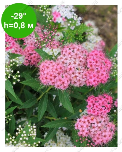 Компактный высокодекоративный сорт, диаметр кроны - 120-150 см. Листья небольшие, вытянутые, темно-зеленые. Цветет в июле-августе маленькими цветочками белого и розового цвета, собранными в щитковые соцветия, причем в одном соцветии встречаются цветы двух оттенков.