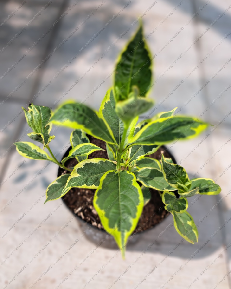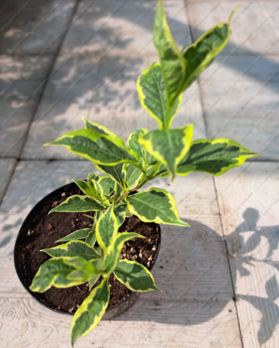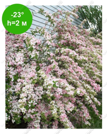 Крона раскидистая, листья нарядные, овальные, с заостренными кончиками, ярко-зеленые с размытой кремово-белой каймой. Цветет в начале лета нежно-розовыми цветами-колокольчиками, длиной до 3 см, собранными в соцветия по 4-5 штук.