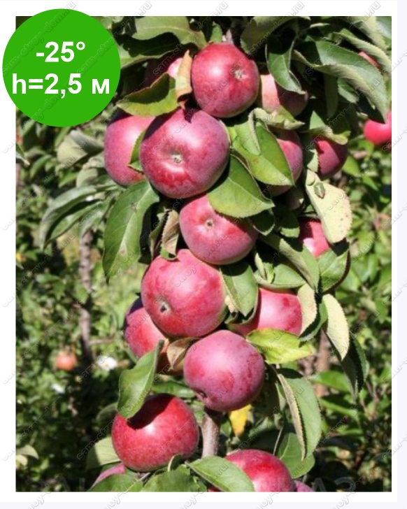 Компактный колонновидный сорт, диаметр кроны около 40 см. Листья округлые, темно-зеленые, корневая система поверхностная. Цветет в конце мая большими розовато-белыми цветами, урожай начинают собирать в конце сентября-начале октября. Плоды крупные, массой до 200 гр. Яблоки не осыпаются, хранятся в прохладном месте до середины февраля. Их употребляют в свежем виде, и используют для приготовления варенья, джемов, компотов.
