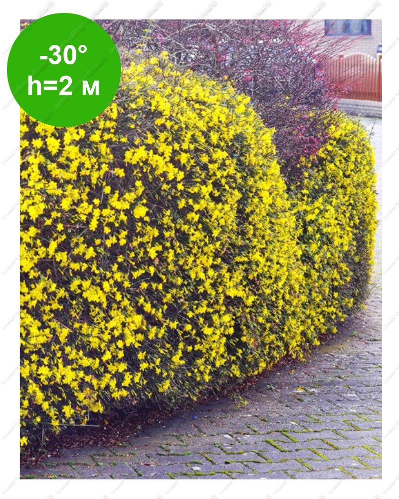 Это морозоустойчивый декоративный кустарник с тонкими пониклыми ветвями и опадающими на зиму листьями. Длинные, тонкие, поникающие побеги издали кажутся зелёным водопадом. Этот листопадный вид относится к семейству маслиновых. Ареал естественного распространения: Северный Китай. Одиночные золотисто-жёлтые яркие цветки распускаются уже в начале зимы. В феврале начинается массовое цветение, которое длится, порою, до конца апреля. Цветки без запаха, но их так много, что кусты сплошь становятся жёлтыми.